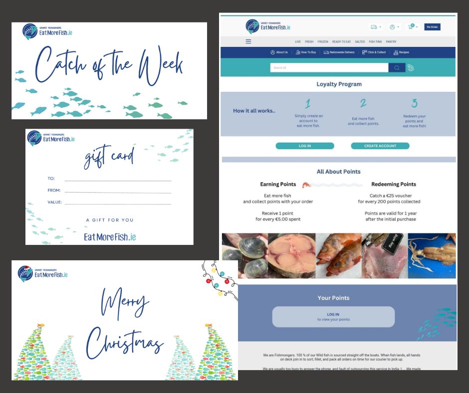 I worked with a local fishmonger to create a cohesive, on-brand look across key customer touch points. This included designing a fresh, user-friendly web page, creating a branded email newsletter template, and developing a custom gift card that reflected the business’s identity. The result was a consistent, professional visual style that helped strengthen the brand both online and in-store.